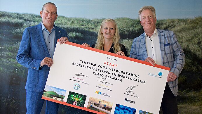 Op donderdagmiddag 6 juli j.l. heeft bij het Ontwikkelingsbedrijf NHN de officiële aftrap plaatsgevonden van het Centrum voor Verduurzaming Bedrijventerreinen Regio Alkmaar. Ilse Zaal (gedeputeerde Economie bij provincie Noord-Holland), René Schoemaker (o.a. wethouder Duurzaamheid en Energietransitie bij gemeente Dijk en Waard) en Rob Niele (voorzitter Ondernemend Regio Alkmaar) hebben deze mijlpaal gezamenlijk bekrachtigd. Het centrum is een organisatie van, voor en door het bedrijfsleven in de regio Alkmaar, dat samenwerkt met haar ondernemersverenigingen, de gemeenten in de regio Alkmaar middels Team Regio Alkmaar, het Ontwikkelingsbedrijf Noord-Holland Noord, de omgevingsdiensten en de provincie Noord-Holland.